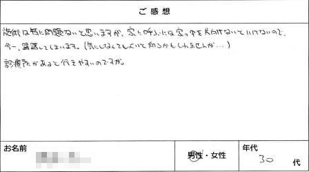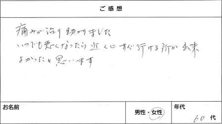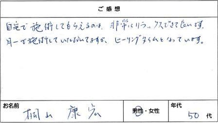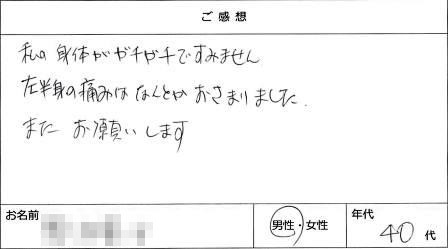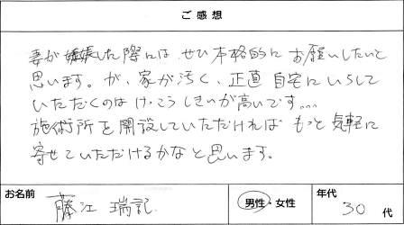 働き盛りのパパさん。肩こり頭痛で慢性疲労。奥さまの話で、翌日起きたらとても臭かったとか!!。指圧によって体中の悪いものが出てきたのかも!?残念がら施術所をかまえるには資金的な体力がなくご迷惑をおかけします。別に部屋をきれいにしてなくてもお気になさらずに呼んでください!!- ■藤江様 30代男性
