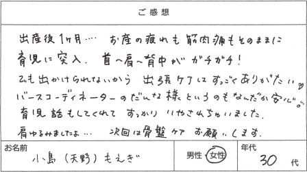 産後ケアで呼んで頂きました。初めてのBABYは産後のママさんは皆さん抱っこするのに力が入ってしまい、授乳にも力が入ってしまっています。落とさないようにしっかり抱っこしてしまうので腱鞘炎になりやすいのですね。腱鞘炎になりにくい抱っこの仕方とか、疲れにくいカラダの使いかたとかも施術後にご指導させて頂いております!!- ■60代女性