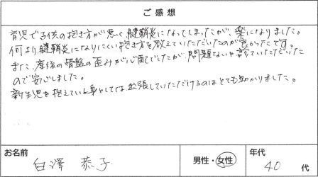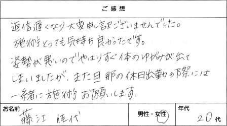 お仕事でお世話になっております。働き盛りの30代。疲れがたまってました。じっくり全身指圧をしてトロトロにしてきました。施術後ご自身のストレッチで背中がバキバキといい音をたてました。かなりゆるんだ様子です。- ■藤江様 20代女性