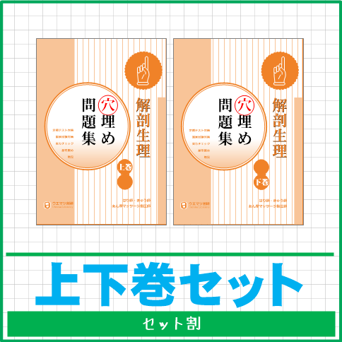 臨床医学各論の「フルコンボ」です。 まず穴埋め問題集で基礎を固め、その後に国家試験問題集を解いて実力を確認していきましょう。 国家試験では、教科書に掲載されていない病名が出題されることもあり、調べるのに時間を要する場合があります。 しかし、この穴埋め問題集には、そうした教科書未掲載の病名も収録されています。巻末のインデックスを活用すれば効率的に検索できます。 上・下巻を揃えておくことで、安心して国家試験の学習を進められる定番セットです。 →ショッピングサイトはこちらから →臨床医学各論 穴埋め問題集の商品説明 →臨床医学各論 国家試験問題集の商品説明 - ■解剖生理 穴埋め問題集(上・下巻)